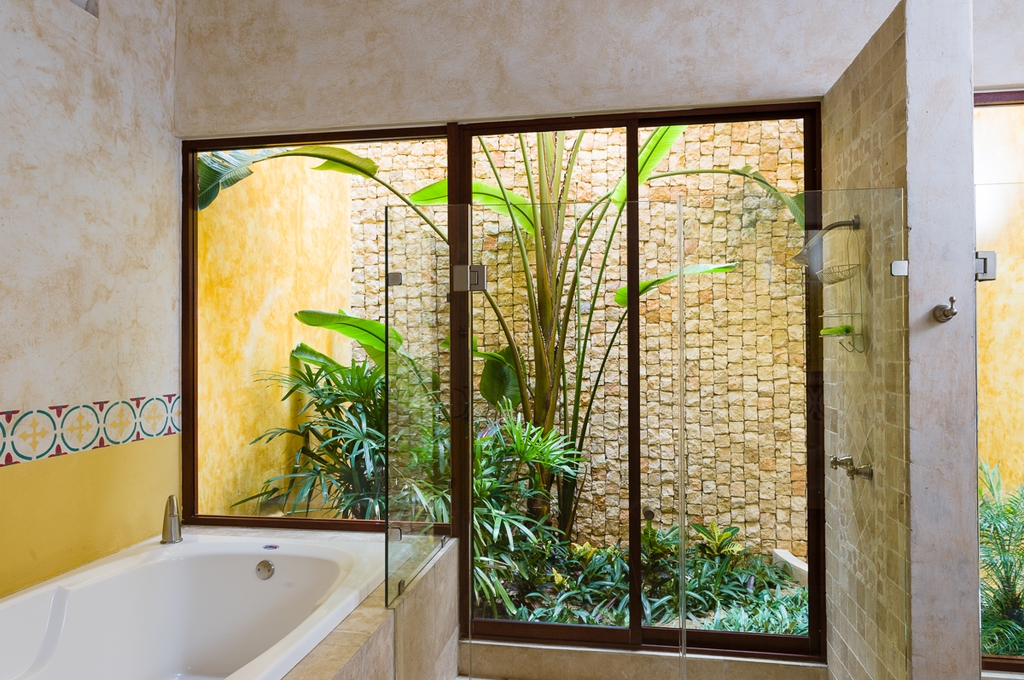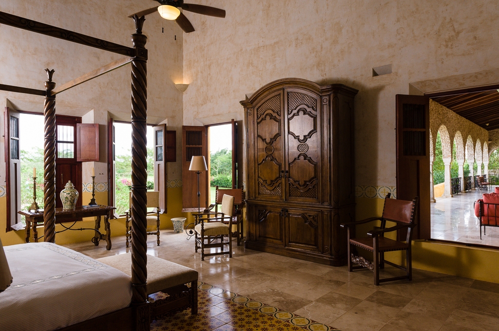 Ese mismo corredor conduce a las amplias recamaras que muestran los elementos principales de diseño regional: doble altura, vigas de madera, altos ventanales, tapetes de pasta, colores intensos y mobiliario rústico de madera.